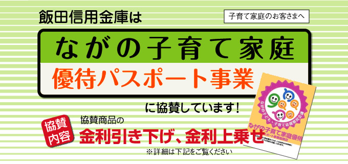平成22年7月1日より飯田市が本事業へ参加することに伴い、当金庫も協賛商品を取り揃え、地域のご家庭を応援させていただくことになりました。参加市町村も今後増加が見込まれることから、地域の多くの子育て家庭でご利用いただけるものとご案内申し上げます。