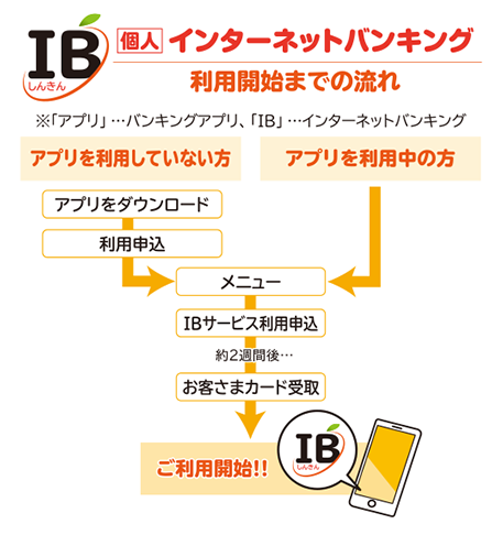ご利用方法 バンキングアプリをダウンロードの上、下記のとおりアプリからお申し込みください。 アプリの詳細はこちら ※ブラウザのみでインターネットバンキングを使用する場合は、通帳・印鑑・本人確認書類をご用意の上、店頭にてお申し込みください。